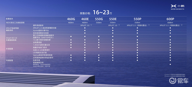 首先所有的车型,第一条线是以续航,也就是说参考G3i,续航作为各个价格的划分,这是一道横向。还有一条竖线就是智能,P就是最顶配,E就是次之,P代表3.5,E是3.0,N就是2.5,G就是裸车。小鹏汽车是用这两大主线作为配置区分。