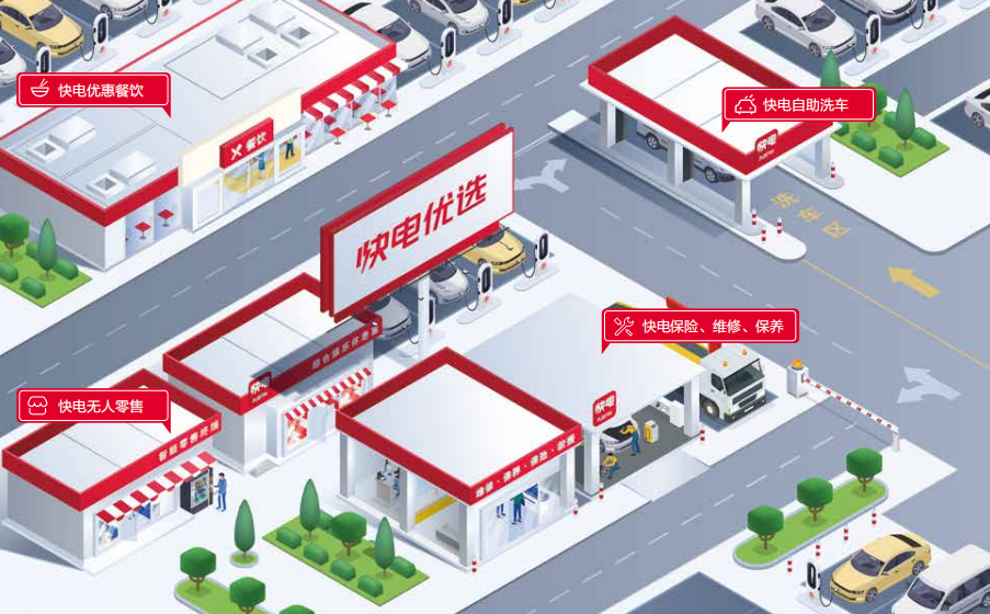 快电为整体充电站进行了赋能,在充电站当中引入连锁餐饮品牌、连锁洗车以及无人售货,为终端用户解决刚性需求。