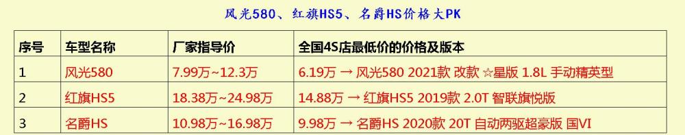 上述分享给诸位的车型里,其中指导售价相对最低的车型是风光580,再者是名爵HS,价格较高的是红旗HS5,分别为7.99万、10.98万和18.38万。值得留意的是,同一款车型的标准价与成交价的差别的确是不少的。据了解,风光580、红旗HS5、名爵HS的国内最低的裸车价为6.19万、14.88万以及9.98万。不知不觉又来到本文的尾声了,不知道你们瞧上风光580还是红旗HS5呢?最后衷心祝亲爱的诸位笑口常开、财源滚滚。