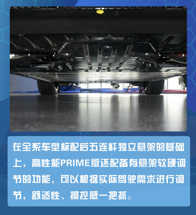 悬架软硬调节是也是高性能PRIME版的专属配置,对于不同的路况和驾驶状态进行相应的调整,想要体验运动化的操控感,将底盘调的硬一些就可以增强车辆的转弯时的支撑性;碰到一些非铺装路面的时候,可以将底盘调的软一些,就可以把细碎的颠簸过滤掉,给乘客更舒服的乘坐体验。