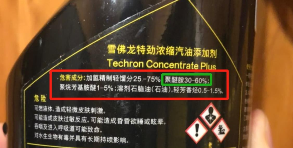 就这么一丢丢,能除积碳出鬼了~一般大品牌的燃油添加剂都会标明有效成分含量区间时多少,泰哥就拿同样大厂的雪佛龙举个例子:绿框中的是有效成分PEA聚醚胺含量是30-60%,300ml当中含多少清净剂成分,自己一算就知道了吧~