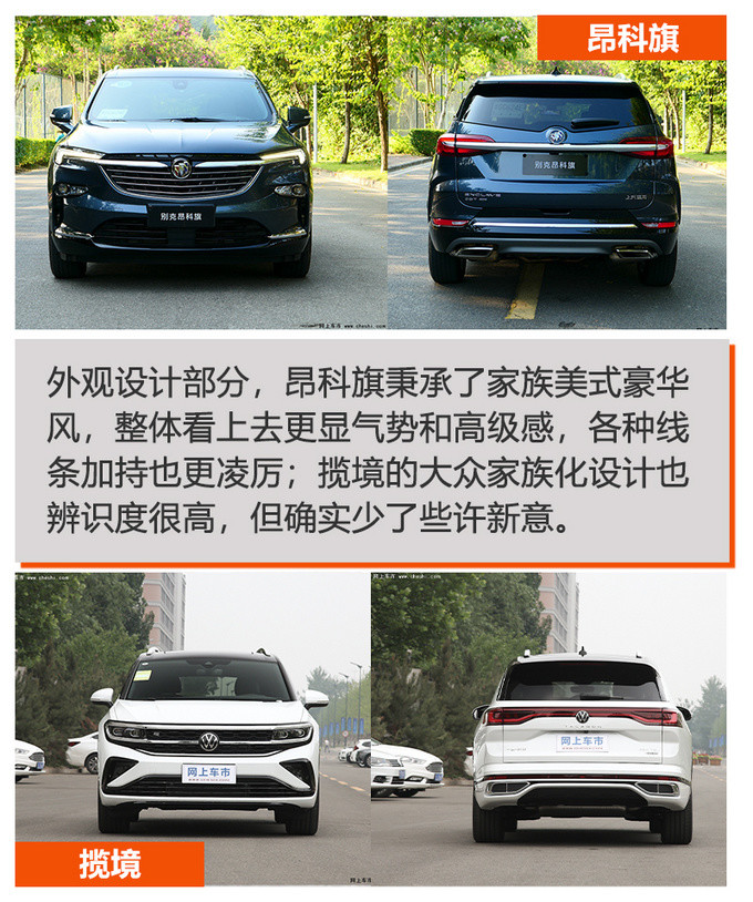 结语:虽然两款车型的指导价均为35.99万元,且同为配有四驱及多种驾驶模式的中大型SUV,但两款车型的匹配人群却完全不同,昂科旗无论是外观设计,还是内饰的选材用料等,将设计感和豪华质感完美体现,7座的设计保障了乘客数量,但在空间方面表现一般,多口之家的市内代步和郊区周末游非常适用,而7座带来的困扰则是后备厢储物能力的不足,长途旅行差强人意;揽境则选择了6座布局,虽额定乘坐人数减少一名,但独立座椅及大空间设计带来的超高舒适性,却是7座车型所不能比拟的,无论长途还是短途自驾,对于驾乘者的空间及舒适性体验非常友好,同时较大车身尺寸也提供了相对更强的载物能力,加之多项车内舒适性配置,无疑是自驾旅行爱好者的福音。