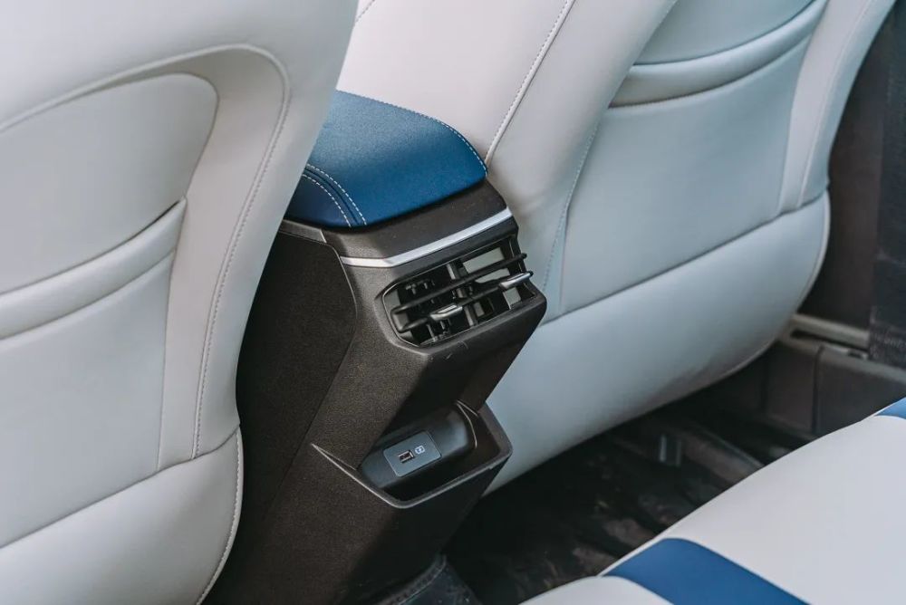 在后排表现上,先来说说座椅的感受:前排座椅在发泡棉的厚实度上要比后排更佳,因此后排座椅相对前排整体上更硬一些,不过这样的差异并不会影响到帝豪后排的乘坐体验,坐垫的长度对大腿的承托表现不错,同时麂皮与打孔透气皮革的材质组合也很有诚意,在座椅的触感上能明显感受到第四代帝豪在做工细节上的进步。此外还为后排乘客提供了独立的空调出风口和一个USB接口,在湖州炎热的夏日坐在后排吹着空调还能给手机补电。略显遗憾的是没有配备中央扶手和中间座位的独立头枕。