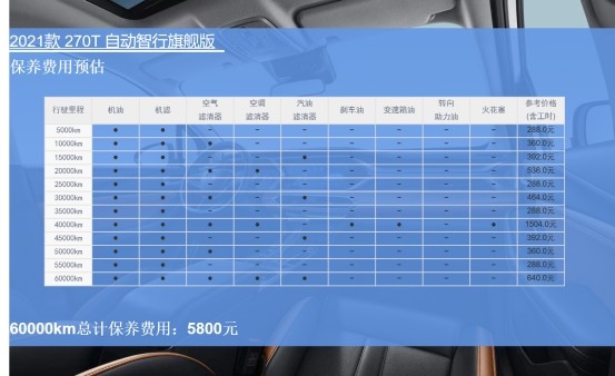 说完了燃油费用和保险费用,那接下来就是保养费用了,对于大部分消费者来说,质保期内肯定是在4S店来保养的,过了质保期有些朋友会选择在其他第三方机构来保养,270T 自动智行旗舰版的保养间隔是每5000km,更换机油机滤加上工时费288元,我们大致计算一下,60000km的总保养费用是5800元,按照一年20000km计算,每年保养花费约等于1933元。