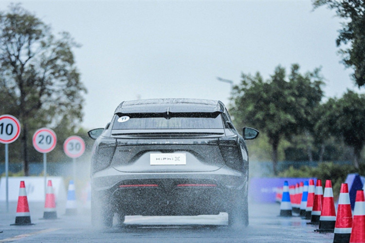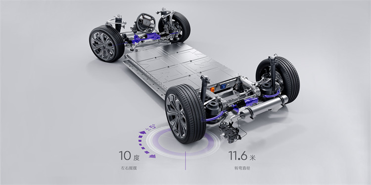 从底盘来看,高合HiPhi X称得上野心勃勃,双电机四驱、双叉臂前桥、后轮主动转向、CDC连续可调阻尼减震系统无不述说着运动定位。具体来看,高合HiPhi X采用前双叉臂、后五连杆的悬挂结构,并配有空气弹簧和CDC减振器。其中,前悬挂的下控制臂为一体式A臂,而不是民用高端车型常见的双球节结构。此外,新车还配备了四轮转向系统,在特定车速区间内机电装置对后轮束角进行动态控制,单侧最大转角可达5°。虽然是一辆超过5米的“大块头”,但是得益于高合HiPhi X配备有趋势化的后轮主动转向系统,使得车辆最小转弯直径达到11.6米,再配合精准的转向,可以让其在拥堵的城市驾驶中更加从容。可以满足不同驾驶场景下的稳定性和操控。