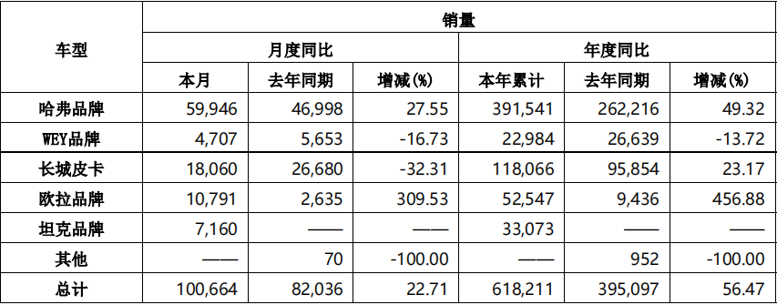 今年以来长城汽车形成了以老品牌哈弗、长城皮卡、WEY和新品牌欧拉、坦克的五大主力品牌,上半年总体销量达到61.8万辆,同比增长56%。
