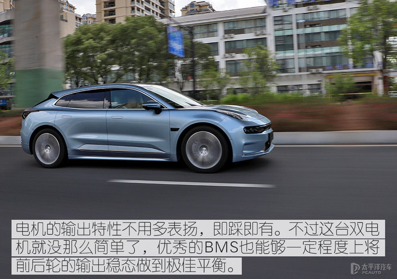 那么具体到体感部分和驾驶感受,油门踏板的高度是略高的,所以整台车的敏感性很足,脚踝部分的小旷量位移就会使新车有着窜动。前后双电机的布置使得车辆加速的平稳度得到了保障,毕竟扭矩过大无论是前驱还是后驱,单电机的布置总会让目前的新能源车有过大的推重比。好在这一切在这台极氪001上并不会出现,它的提速就像一台核动力潜艇,稳定、高效、极速。