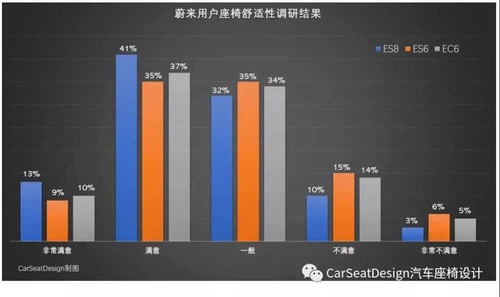 特别有趣的是,最后对座椅表示非常不满意的,按 ES8、ES6、EC6 来分,分别有 3%、6%、5%;不满意的是 10%、15%、14%;同时,非常满意的是 13%、9%、10%;满意的是 42%、35%、37%。