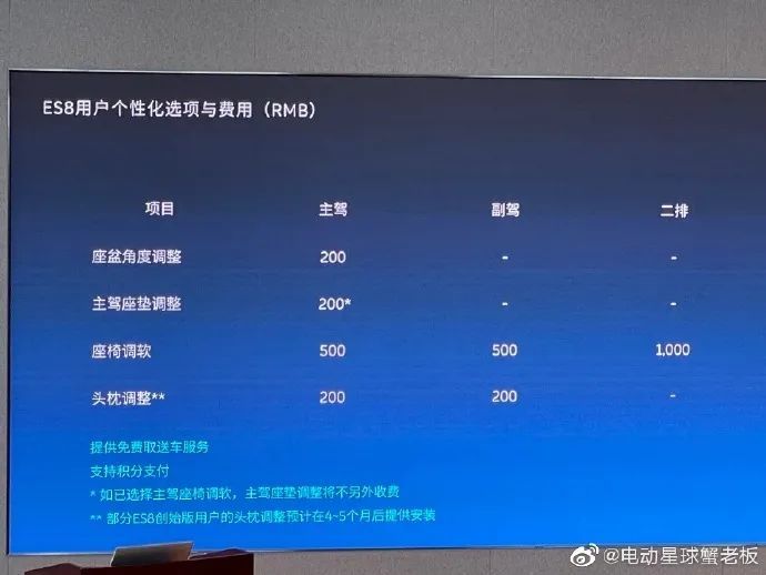 其中 ES8 座椅一共提供主驾、副驾、二排一共 7 项座椅个性方案。包括座椅调软、角度调整等等,如果用户决定全选,不重复的项目一共收费 2600 元,单项最低 200 元。