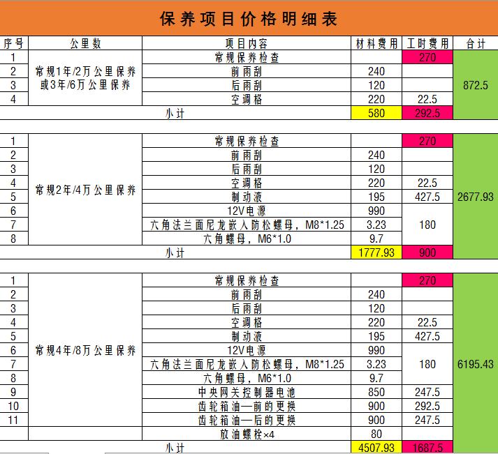上图是蔚来的保养项目价格明细表。其中「工时费」一栏里面,1 年/2 万公里(或 3 年/6 万公里)的材料费用需要 580 元,工时费 292.5 元;2 年/4 万公里的材料费需要 1777.93 元,工时费 900 元;4 年/8 万公里的材料费 4507.93元,工时费 1687.5 元。