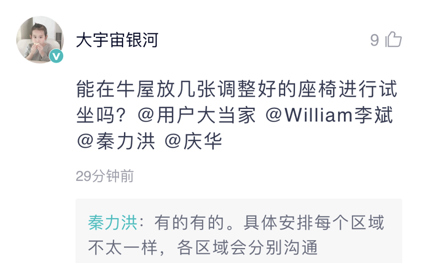 发稿前,蔚来已经在官方 APP 进一步公开了座椅个性化调节计划的更多细则。秦力洪则在评论区表示,会在牛屋放几张调整好的座椅供大家试坐,具体各区域会各自沟通。