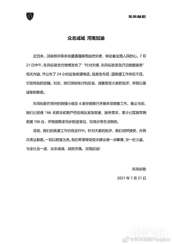 7月21日凌晨,东风标致正式发文致歉。东风标致表示,发布救援信息后,因救援工作存在不足,引发网友的质疑,对此,我们深刻检讨和反省,诚意接受大家的批评,并致以最诚挚的歉意。