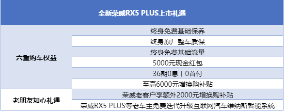 7月6日,智联网汽车创领者全新荣威RX5 PLUS正式上市,共推出五款车型,官方指导价10.38-13.98万元。新车拥有全新一代“双十佳”蓝芯动力总成、互联网汽车维纳斯智能系统、全新国潮设计,满足年轻人对高品质出行的需求。同时,新车还带来了“六重购车权益”:5000元现金红包、36期0息/0首付、至高6000元增换购补贴、终身免费基础保养、终身原厂整车质保、终身免费基础流量,领潮惊喜价仅9.88-13.48万元。此外,荣威老客户还可享“老朋友知心礼遇”,额外获赠2000元增换购补贴,荣威RX5 PLUS等老车主可免费迭代升级互联网汽车维纳斯智能系统。