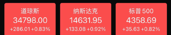 截至收盘,道指涨0.83%,报34,798.00点;标普500涨0.82%,报4,358.69点;纳指涨0.92%,报14,632.00点。
