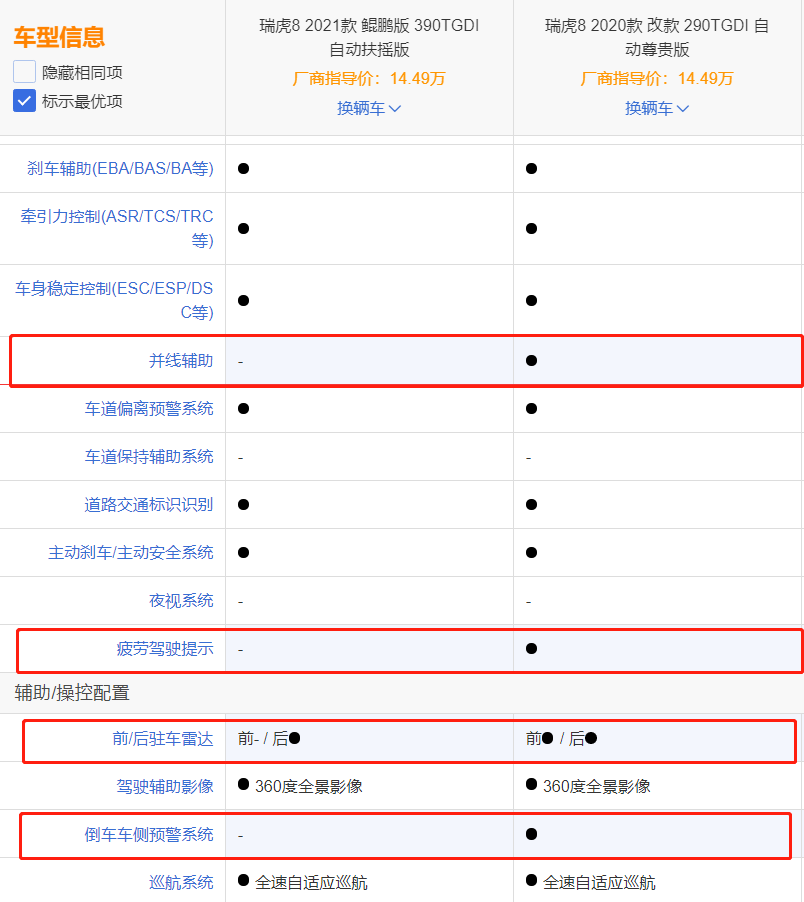 但其实我们直接拿售价14.49万的顶配瑞虎8鲲鹏版390TGDI扶摇版与同样售价14.49万的2020款瑞虎8改款290TGDI自动尊贵版进行配置对比,结果或许会让人吃惊。