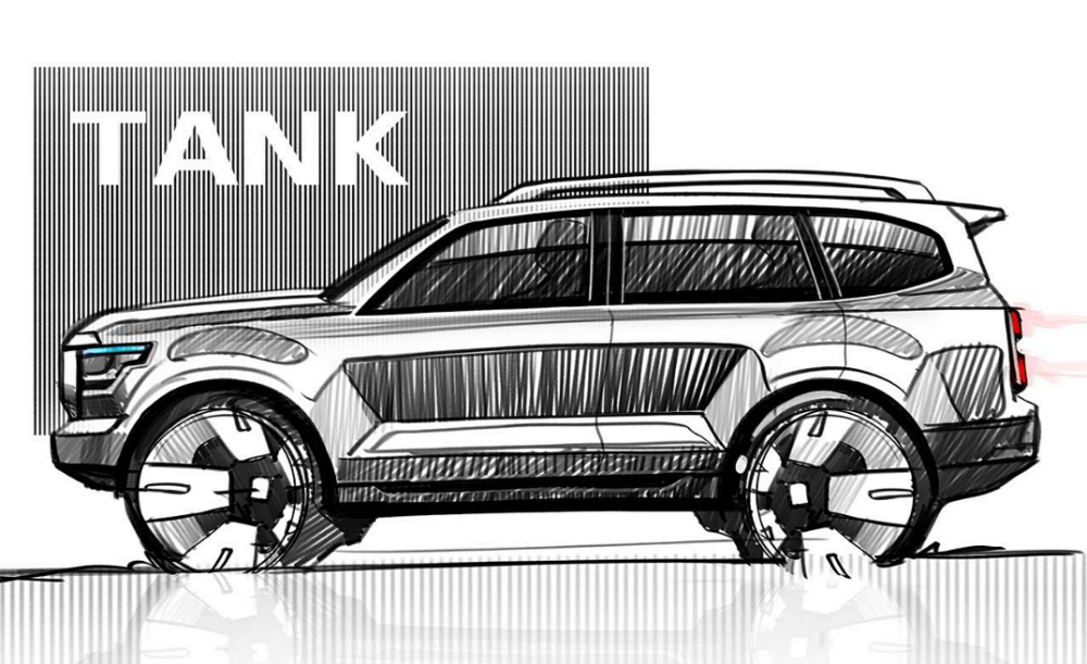 此前长城汽车比较保守地展示了坦克600车型的设计稿,该车型的外观造型和坦克700有点类似,并没有保持坦克300的复古设计语言,车头前脸将会提供六边形横纹进气中网,两侧搭配狭长的LED矩阵大灯,而非圆形复古灯光。车身侧面确实比坦克300更加壮实,尺寸定位预计至少会达到中型SUV以上,因为C柱后方已经有很明显的超大侧窗。