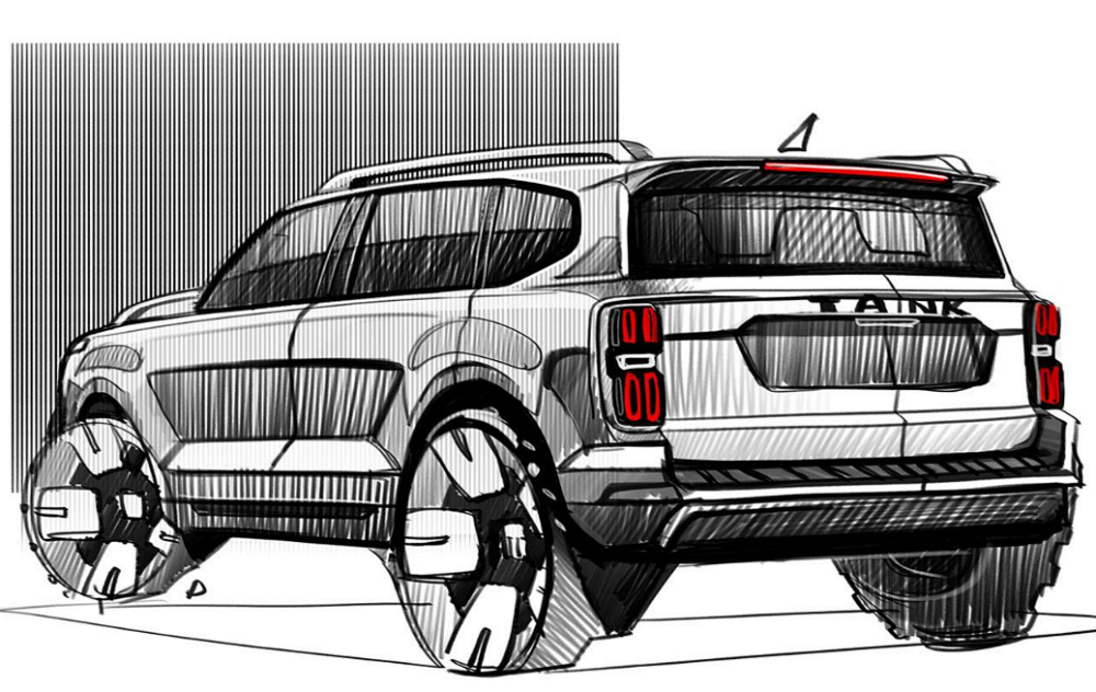 比较遗憾的是坦克600这款车设计稿当中并没有看到小书包备胎,尾部没有备胎箱,直接悬挂了全新设计的坦克品牌英文字母车标,这和坦克800比较类似。当然竖条纹立体式尾灯和坦克300还是比较类似的,这也算是继承了家族设计语言。