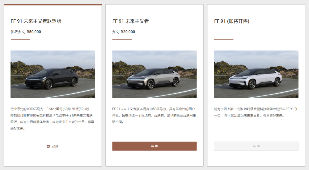 值得一提的是,FF官网也显示,贾跃亭打造的FF 91量产版开启预订,预订金2-5万元。