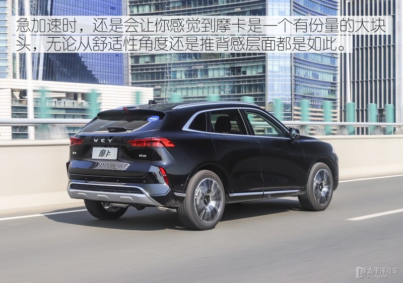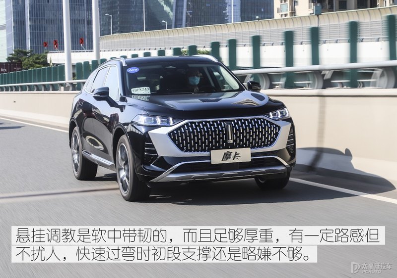 底盘调校是软中带韧的,给第一感觉就是厚重且充满韧劲。经过路上一些小坑洼时,车内能够感受得的动静并不多,遇到一些如减速带时,车辆没有多余的晃动。这除了跟底盘调校有关外,也离不开WEY的良好隔音性能。不过在快速过弯时,悬架初段支撑还是略嫌不够。这点遗憾或许在未来推出带主动电磁悬架的高配车型上能很好解决,而且舒适性也会有很大的提升,是未来比较越级的配置了。