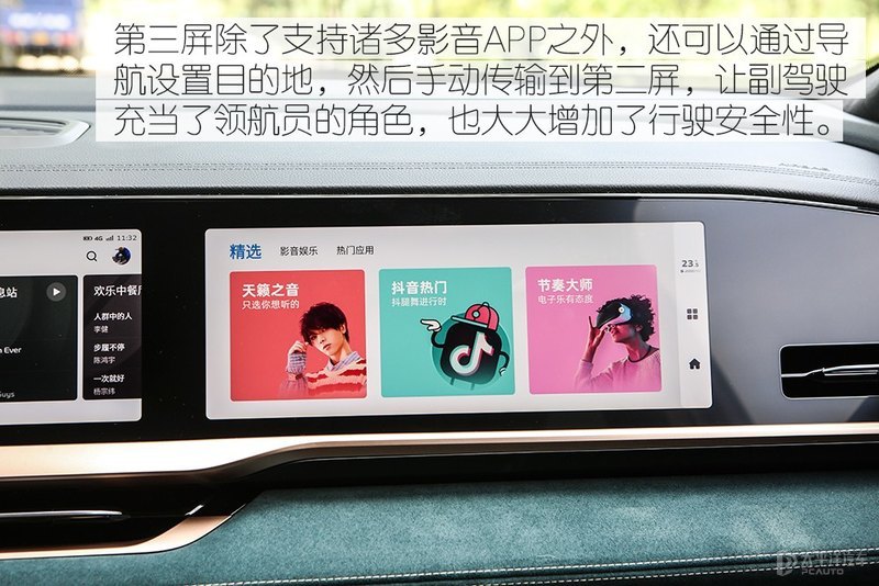只要坐进车内你才能充分体会到星越L的豪华,整体营造的乘坐氛围超越了合资水准,全车大面积的麂皮材质把你全全包围,让你时刻都沉浸在运动和高级之中。车内最大的亮点就是三屏设计,各司其职但是又相互连通,不仅有满满的科技感,而且娱乐性和实用性还是相当之高。第三屏除了支持一些影音功能之外,还可以设置导航目的地,然后手动传输到第二屏,第二屏通过三指操作还可以把导航界面移动到仪表盘中显示,副驾驶可以帮主驾驶分担一部分操作,这也大大提升了主驾的驾驶注意力,行车安全在一定成程度上也得到了提升。