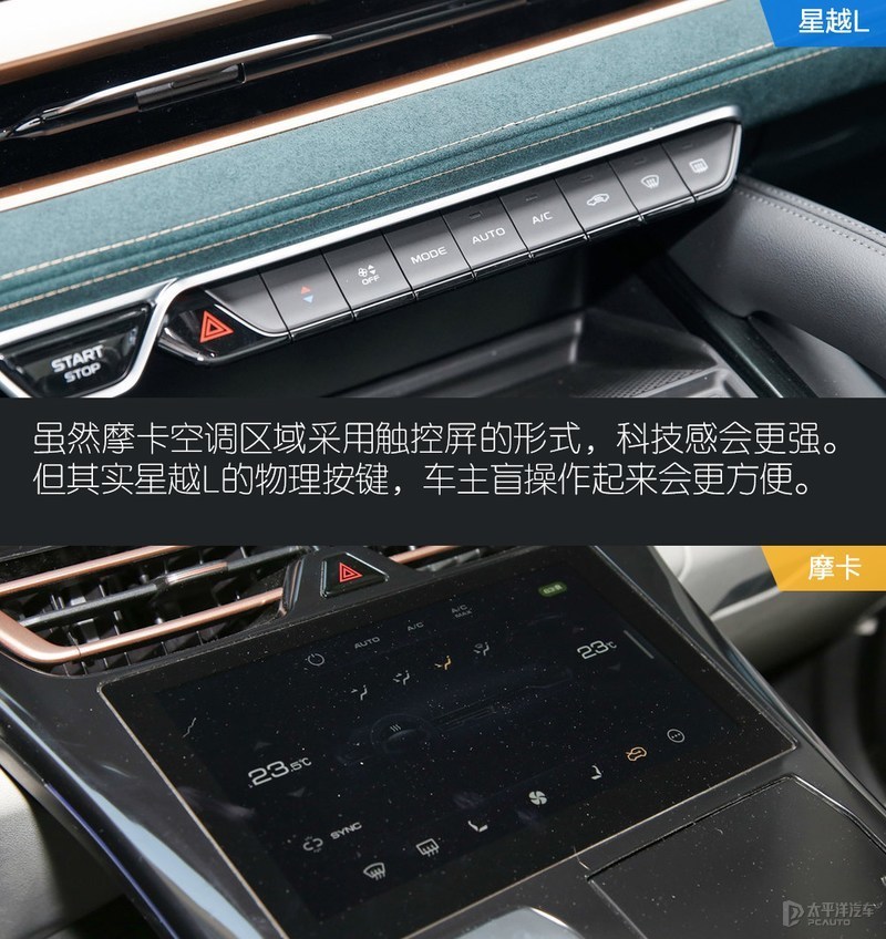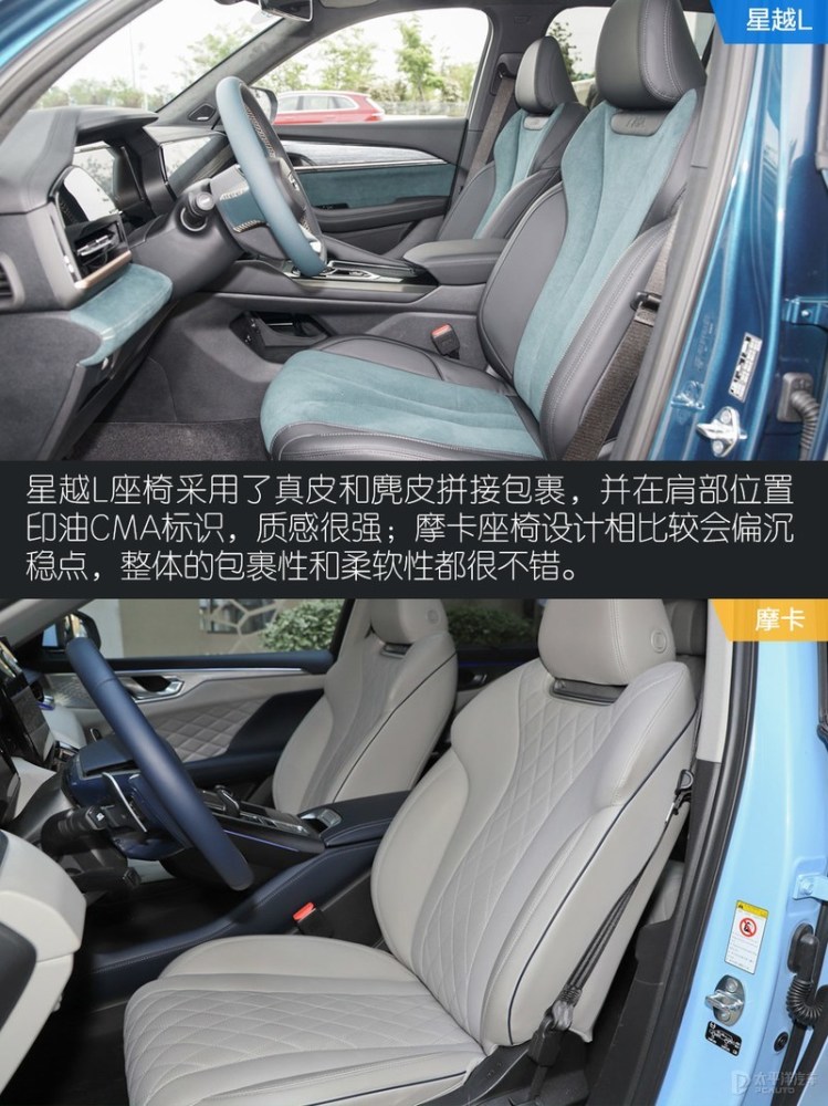 两车内饰设计和用料各有千秋,加上车内大屏均营造了不错的科技感。相比摩卡车内被大面积的软性材质包覆,星越L车内能摸到的地方都采用了大量麂皮包覆,营造了更高级的氛围。