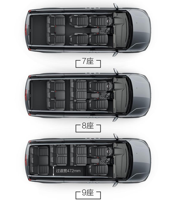 而从曝光的内饰图片来看,不仅能看到中控台的设计,还能看到该车根据不同座椅数量进而设计出不同的布局,像常见的7座车,该车采用2+2+3的布局,进入第三排的过道位于第二排座椅中间位置;提供8座车型,采用2+3+3的布局,通往第三排的过道隐藏在第二排边侧座椅内;而提供9座的车型,采用2+2+2+3的布局,第二排与第三排采用联排设计,统一往主驾驶一侧靠拢,空留出拥有472mm宽的过道,可以轻松通往第四排。