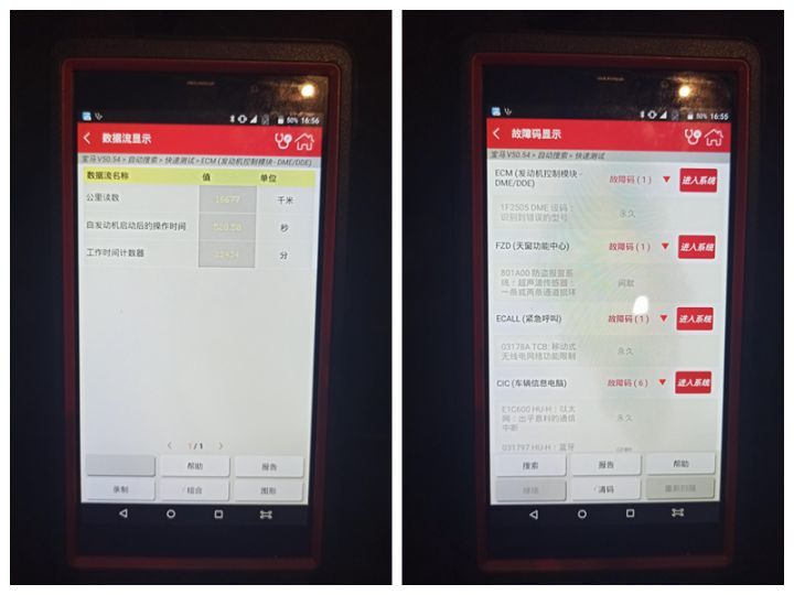 连接OBD电脑读取车身系统故障代码,发现有多个永久性代码,而且清除不了,只能去4S店或者专业维修宝马的修理厂用专检电脑检修了。随后读取车辆里程数据,根据公里读数,发动机启动时间,以及内饰磨损程度综合判断车子没有调表的情况。