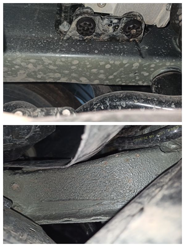 视线前移到左前纵梁,上面第一张图是纵梁最前端,下面是纵梁与防火墙的连接附件,两者颜色明显不同,前段看起来非常自然,后部就像是喷了底盘装甲一样。