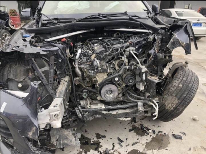从图片上看到车子当时车头左侧严重受损,左前大梁明显变形位移,左前叶子板梁完全报废,减震塔顶变形翘起来了,整个元宝梁前部变形,发动机倒是没看到破损。