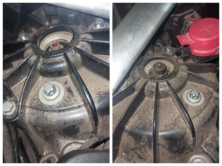 继续检查减震顶部螺丝,两边螺丝均有轻微拧动痕迹,而且螺丝顶部和底部垫片有新旧成色上的差异,这螺丝分明是后期处理过的。既然减震螺丝都拆过了,说明前面的事故就不是更换机盖大灯保险杠那么简单了。