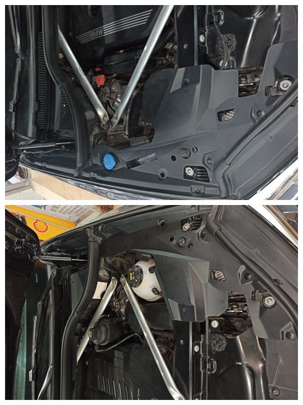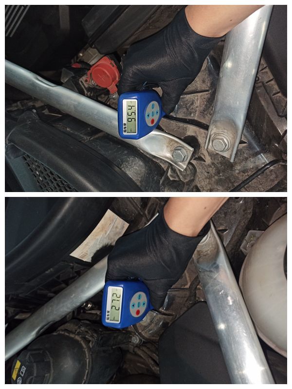再回头看两边减震塔顶的漆面,左侧塔顶漆面厚度比右边高出许多,肯定是有喷漆了,但是靓仔我怎么看这减震塔顶都不像是有变形修复啊!