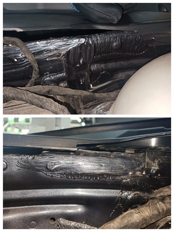 跟右侧纵梁对比一下就能看到区别,不论是钣金胶和颜色都是不同的两个事物。