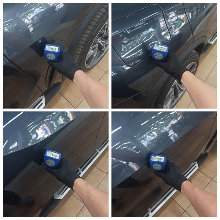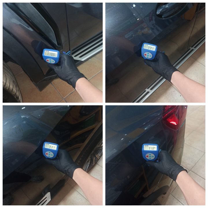 左前叶子板靠近车门下边这里有过刮蹭,做了钣金刮腻子,漆面厚度高达1186μm。左前门、左后门、左后叶子板都是原车漆。