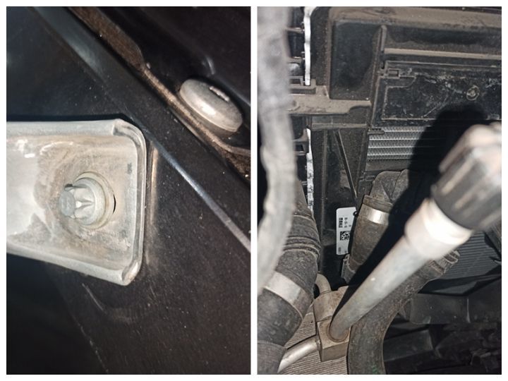 于是靓仔我仔细查看机盖合页底部螺丝有没有拆卸痕迹,因为底部螺丝不是很显眼,或许没有二次喷漆,果然看到了左侧机盖合页螺丝有磨损掉漆和拧动痕迹,而右侧合页螺丝没有异样,从这里可以判断机盖螺丝是有二次喷漆的。为何要二次喷漆呢?肯定是要掩盖一些问题,靓仔大胆猜测车辆有过精修。