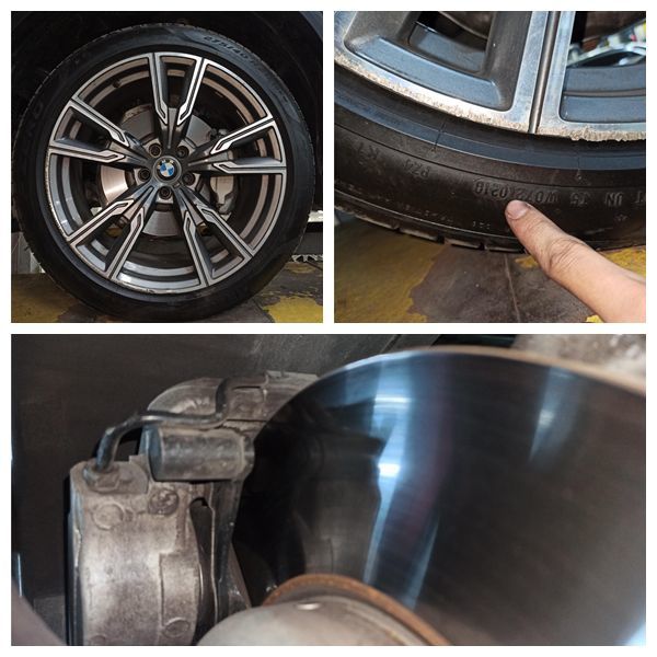 最后检测轮胎轮毂刹车片刹车盘等部件,轮毂均有一些剐蹭,轮胎为2018年的,刹车片还很厚,刹车盘边缘无起槽,均能正常使用。