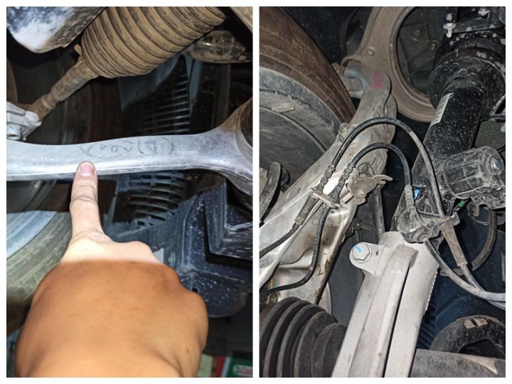 左侧摆臂和减震转向节都是后期更换的,上面还有一些配件商家做的红色记号,右侧未更换的零部件都没有记号。
