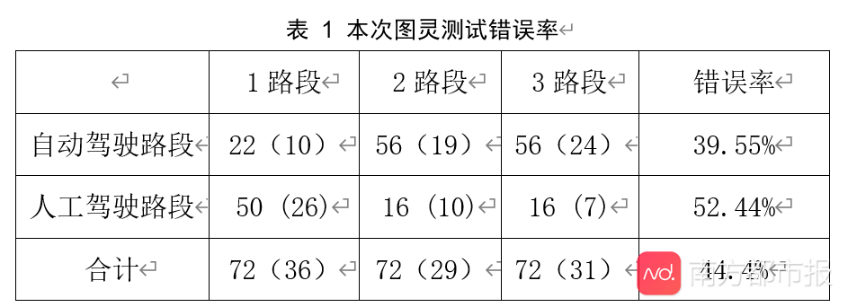 本次测试总计录得有效测试路段216段,乘客平均推断错误率达到44.4%,这意味着有近一半的测试阶段乘客无法判断出测试车辆的驾驶模式;按照图灵本人当年的设计“让计算机来冒充人,如果不足70%的人判对,也就是超过30%的裁判误以为在和自己说话的是人而非计算机,那就算作成功了”。(注:表中括号外为实际测试路段数括号内为乘客推测错误数)。