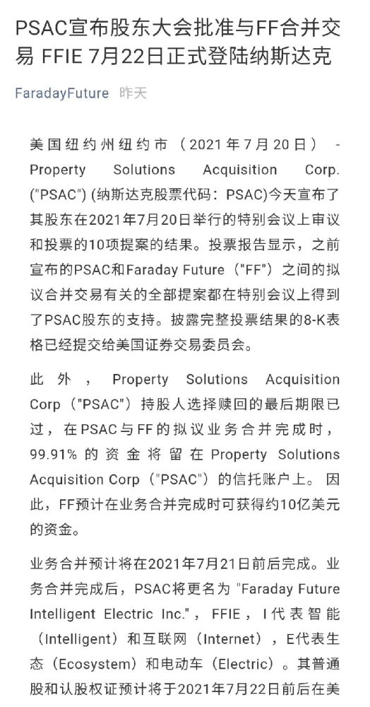 FF官方也表示,上市时间定为美国东部时间2021年7月22日上午8点10分,也就是北京时间昨晚8点10分,股票代码为“FFIE”,这也是FF与PSAC合并后公司的名称的缩写——"Faraday Future Intelligent Electric Inc."。