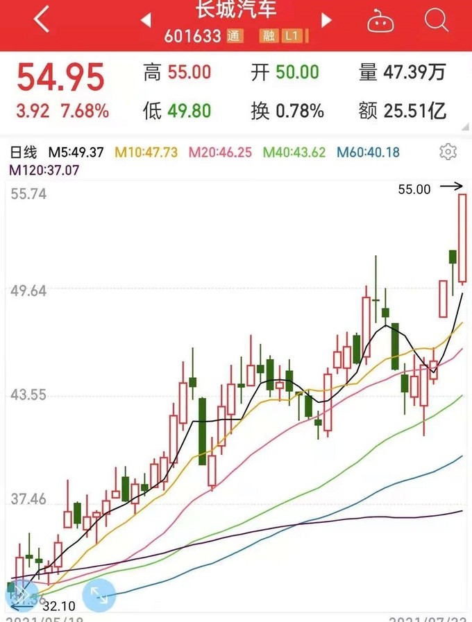 7月23日,截至A股收盘,长城汽车大涨7.68%,每股报收于54.95元,超越1月13日创下的每股49.53元的阶段性高点。至此,长城汽车A股总市值正式突破5000亿元。