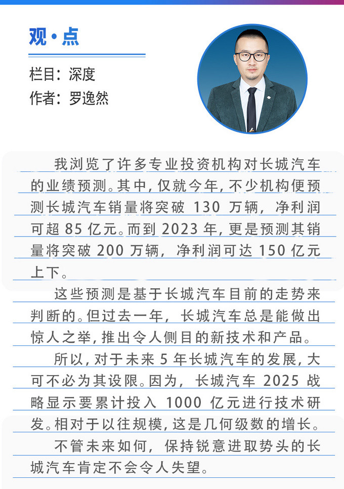 所以,对于未来5年长城汽车的发展,大可不必为其设限。因为,长城汽车2025战略显示要累计投入1000亿元进行技术研发。相对于以往规模,这是几何级数的增长。