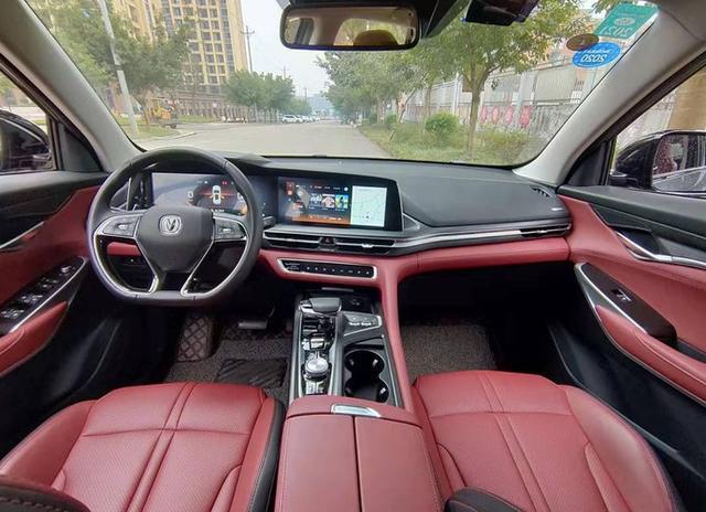 内饰方面,两台车的设计风格也采用了各自家族的设计语言。CS75PLUS的两块12.3英寸液晶屏很抢眼,配合酒红色皮质座椅,略显大气。而大众探岳则是典型的大众风格。用料方面,两车在中控台上方均采用了软性材质。长安CS75PLUS在中间部分采用了皮质包覆;探岳为硬性银色饰板;下方两车都是硬性材质。