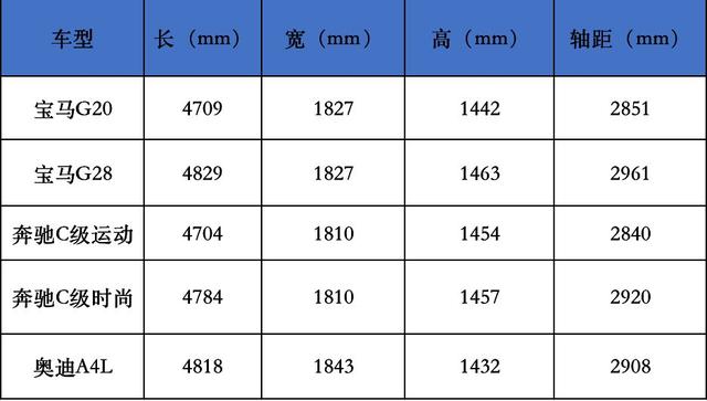 宝马三系在国内向来有加长的传统,标轴版(G20)相比上一代车型要减重了55kg,长宽高:4709/1827/1424mm,轴距:2851mm。长轴版(G28)长宽高:4829/1827/1463mm,轴距:2961mm。和竞争对手(A4L、奔驰C级)相比,大家可以直观看图。