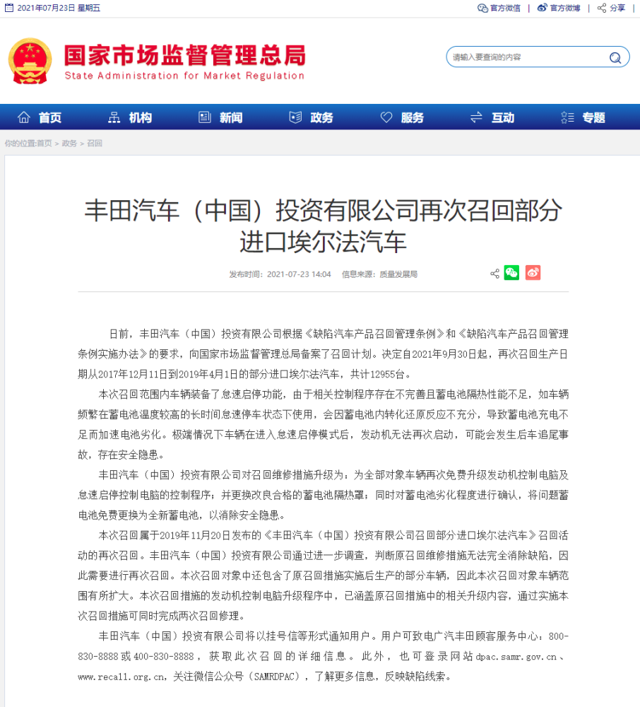 7月23日下午,国家市场监督管理总局发布召回信息,丰田中国宣布自2021年9月30日起,再次召回生产日期从2017年12月11日到2019年4月1日的部分进口埃尔法汽车,共计12955台。