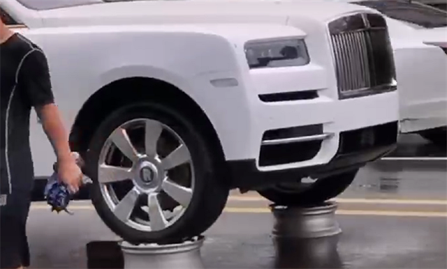 原来,这台劳斯莱斯的前轮下方垫了轮毂,而后轮下方垫了砖头,直接把整台车“增高”了,而水位最高的时候,也不过没过了劳斯莱斯库里南的底盘而已,因此这台车完全没事,据说还是保险公司帮车主这么垫的。