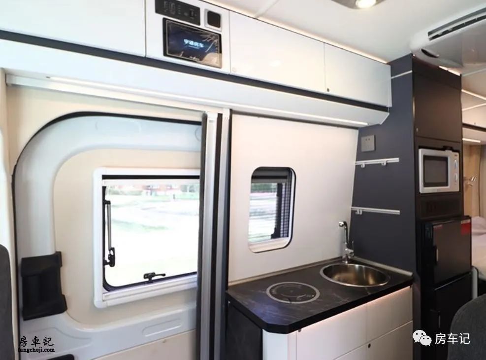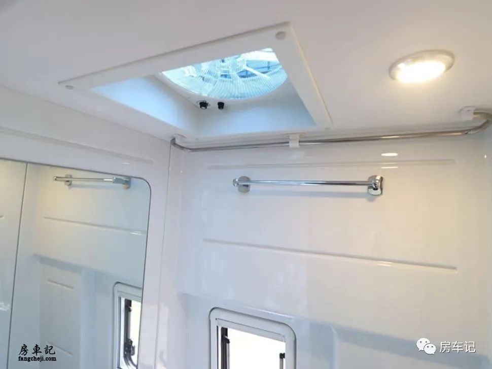 除了配色还材质上的升级,车厢顶部还加入了一个尺寸超大的天窗,进一步提升车内的通透感,在漫天星空的夜晚,坐在车内通过天窗仰望星河,别有一番趣味。驾驶室顶部提供一台19寸的液晶电视,尺寸不是很大,但平常看些资讯、新闻啥的都没有问题,如果追求视听感受,后期可以自选一套投影仪,在车内搭建私人影院。