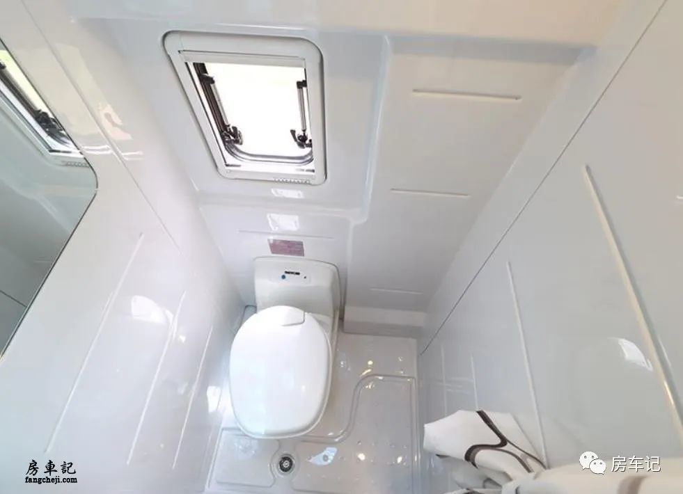 卫生间位于车厢尾部,采用推拉门设计,内部空间相对来说比较一般,但设备却很齐全,除了常规的盒式马桶、淋浴、洗手池、储物盒、换气扇以外,这里还选装了一台洗衣机,洗衣机安装的位置也不会影响到下方马桶的正常使用。水电方面,这款车提供了3000W逆变器、2块225Ah铅酸电池以及120L净水箱和60L污水箱,热水暖风上采用的是换热式热水器和燃油加热器,基本上能够满足日常使用。