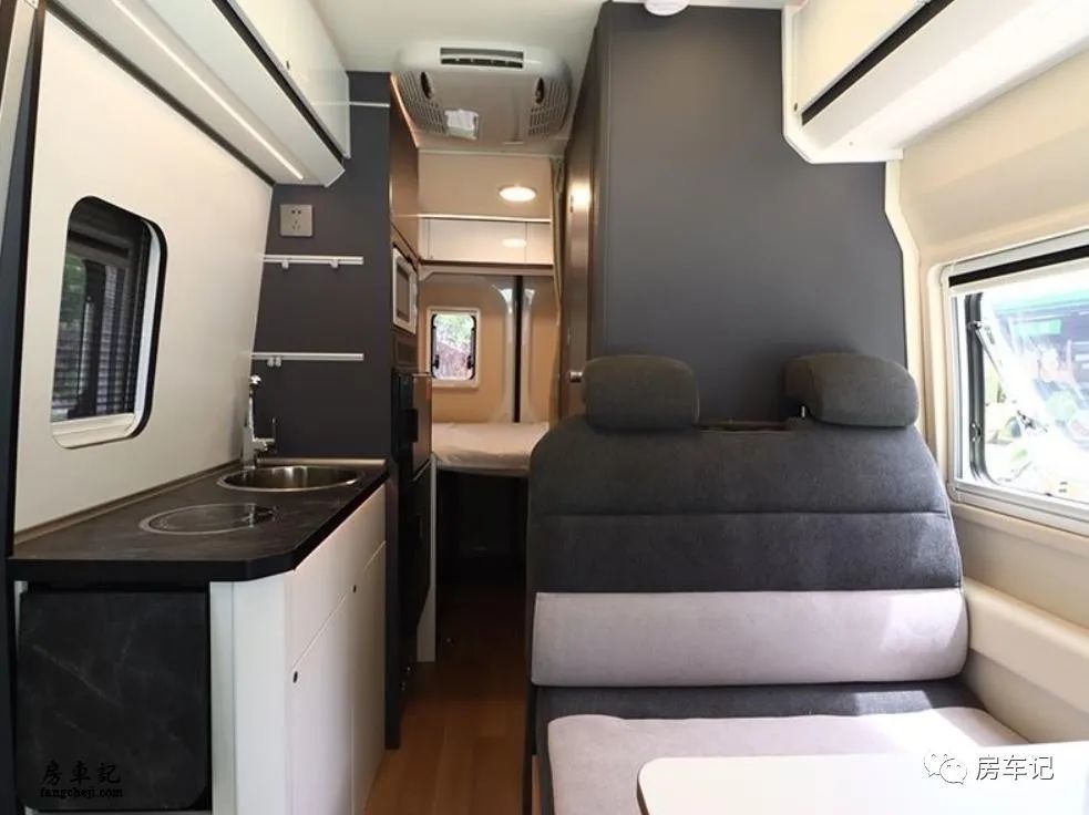 位于车厢侧滑门的厨房提供了电磁炉、85L房车专用冰箱、洗菜池等基础设备,能够满足日常使用需求。后期想要做饭的话,还可以自备一套便携式卡炉在车外使用。位于厨房上方还加入了一台底置分体12V空调,能够提高车内温度的舒适性,除此以外这款车还提供了独立燃油加热器和乘客去独立散热器,全方位的保证车内在温度较低时也可以很暖和。