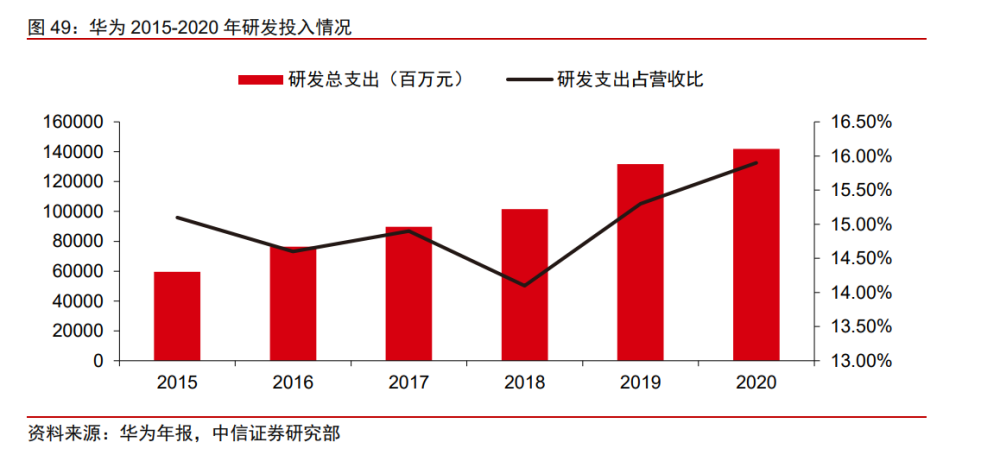 华为拥有强大的研发能力。(1)从 2015 年到 2020 年华为的研发总投入从 596.07 亿元提升到了 1418.93 亿元。华为在最近十年每年都坚持将 10%以上的销售收 入投入研究与开发,在最近的 2020 年中,这个比例甚至提升到了 15.9%。过去 十年中华为的研发总投入已经超过了 7500 亿元。(2)研发人员方面,在过去十 年内华为一直保持着研发人员占总员工 40%以上的占比,并在 2019 年开始进行 了研发人员的扩招。在 2020 年,研发人员占比已经超过了 53%,总研发人员达 到 10.5 万人。