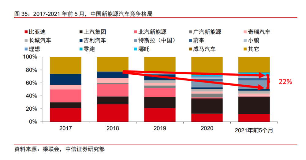 智能汽车产业竞争格局正在发生变化,新品牌迎来建立机遇。随着特斯拉(中国)、蔚来、理想 汽车等智能汽车销量的提升,2021 年前五月,四家造车新势力的市占率达 22%, 行业竞争格局变化较为显著。