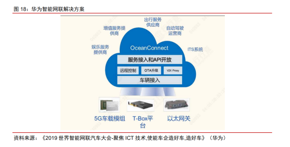智能网联:华为在联网层面,从模块、网关到云平台布局,打造完善的联网方案。 硬件方面,华为提供车内通信的车载模组、T-Box、太网关等部件。软件方面, 华为 OceanConnect 车联网云平台,打造云智能联网解决方案,可支持干万级车辆同时在线。
